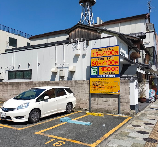 三条通り沿いの当店手前30mほどにあります。通常料金は8:00~22:00まで15分100円当店までの近さと広くて駐車しやすいメリットと料金がやや高いため空いている事が多いです。