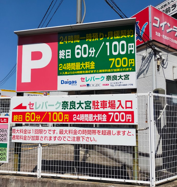 JR奈良駅を出てすぐ左の高架下沿いの駐車場です。当店まで徒歩5分。通常料金は終日60分100円当店まで徒歩5分ですが、料金が安くて駐車しやすい広さのメリットがあります。オリックスレンタカーが駐車場の手前にあります。
