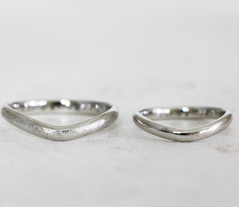 丸くなった指輪の一か所を叩いて、V字にします。浅め、深め。とご自身の力加減で調整できるのでお好みのカタチになります。着けた時に指が長く見えるので、女性に人気。